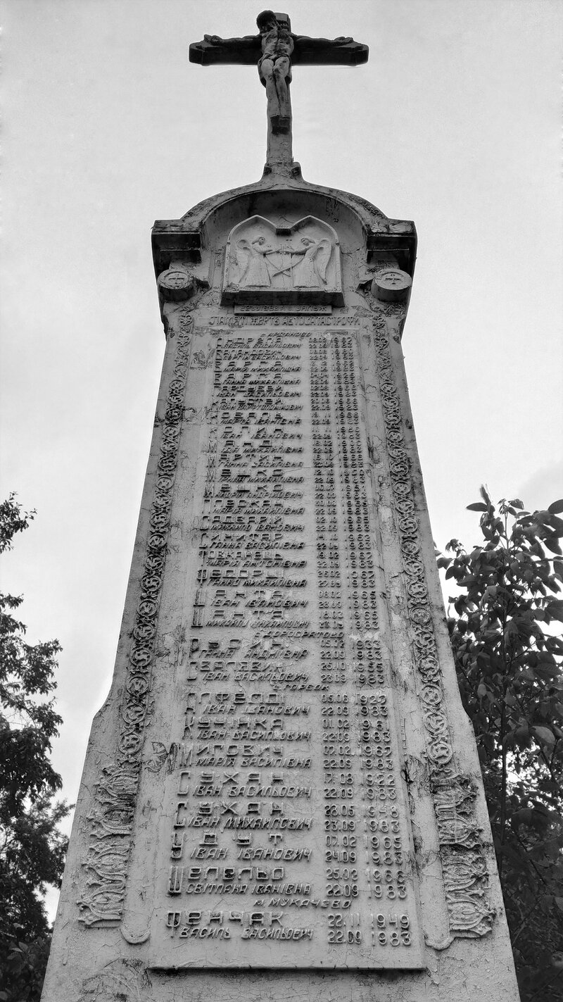 Пам'ятник жертвам страшної трагедії, що сталася у селі Залужжя, Мукачівського району. 22-го вересня 1983-го року, на точці встановлення пам'ятника, внаслідок зіткнення рейсового автобуса «Мукачево - Арданово» та автоцистерни з лаком, що перекинулася. Виникла пожежа, внаслідок чого загинули 29 людей. 18 людей згоріли живцем, 11 померли потім у реанімації. Вижили в аварії всього 7 юнаків та 1 дівчина.
