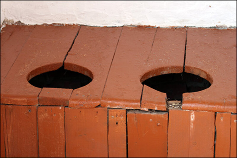 Туалет типу «сортир» на території навчального закладу неподалік церкви в селі Кідьош (уст: Зміївка), Берегівського району. Унікальність даного «закладу» полягає у наявності в кабінках двох «дірок», розташованих на невеликій відстані один від одного, замість однієї класичної.
